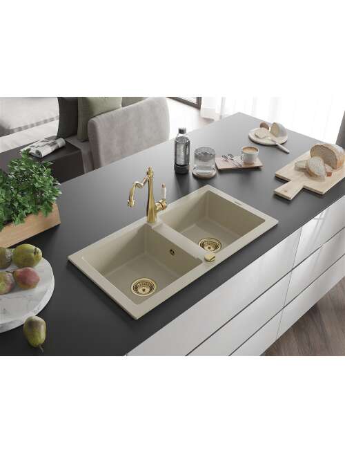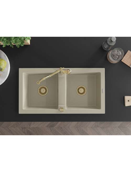 Dane techniczne: Zlewozmywak: Rozmiar: 820x436x161 mm Głębokość komory: 151 mm Wymiary komory: 356x336 mm Średnica odpływu: ø90 mm Typ: 2-komorowy Rodzaj: Wpuszczany w blat Kolor: Beżowy Wykończenie syfonu: Złoty Materiał: Granit (80% kruszywo granitowe 20% żywice) Otwór przelewowy: Tak Otwory: ( bateria, automat ) 2 Wysoka odporność na zarysowania i przebarwienia Odporność na szok termiczny Powierzchnia ułatwiająca czyszczenie Bateria kuchenna: Materiał: Mosiądz Kolor: Złoty Głowica: Ceramiczna Perlator: Tak Typ: Jednouchwytowa Wysokość baterii: 290 mm Zasięg wylewki: 260 mm |