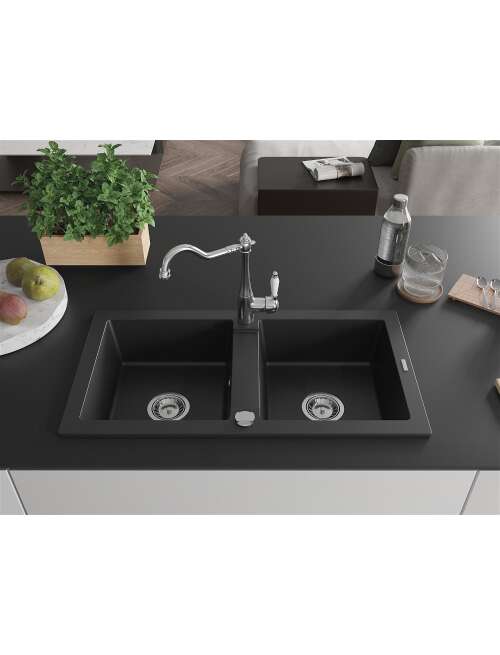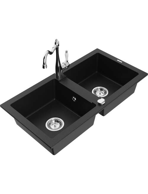 Dane techniczne: Zlewozmywak: Rozmiar: 820x436x161 mm Głębokość komory: 151 mm Wymiary komory: 356x336 mm Średnica odpływu: ø90 mm Typ: 2-komorowy Rodzaj: Wpuszczany w blat Kolor: Czarny Wykończenie syfonu: Chrom Materiał: Granit (80% kruszywo granitowe 20% żywice) Otwór przelewowy: Tak Otwory: ( bateria, automat ) 2 Wysoka odporność na zarysowania i przebarwienia Odporność na szok termiczny Powierzchnia ułatwiająca czyszczenie Bateria kuchenna: Materiał: Mosiądz Kolor: Chrom Głowica: Ceramiczna Perlator: Tak Typ: Jednouchwytowa Wysokość baterii: 290 mm Zasięg wylewki: 260 mm |