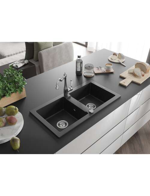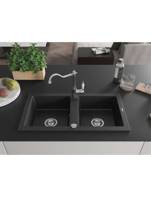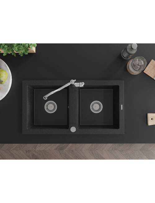 Dane techniczne: Zlewozmywak: Rozmiar: 820x436x161 mm Głębokość komory: 151 mm Wymiary komory: 356x336 mm Średnica odpływu: ø90 mm Typ: 2-komorowy Rodzaj: Wpuszczany w blat Kolor: Czarny/Srebrny metalik Wykończenie syfonu: Chrom Materiał: Granit (80% kruszywo granitowe 20% żywice) Otwór przelewowy: Tak Otwory: ( bateria, automat ) 2 Wysoka odporność na zarysowania i przebarwienia Odporność na szok termiczny Powierzchnia ułatwiająca czyszczenie Bateria kuchenna: Materiał: Mosiądz Kolor: Chrom Głowica: Ceramiczna Perlator: Tak Typ: Jednouchwytowa Wysokość baterii: 290 mm Zasięg wylewki: 260 mm |