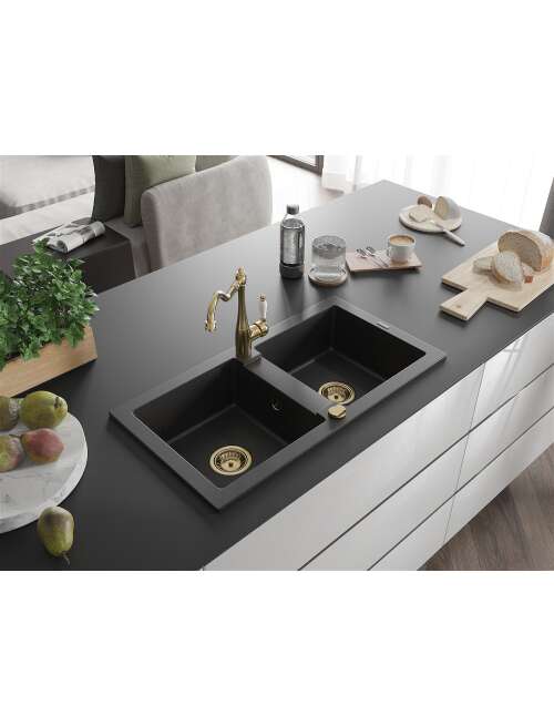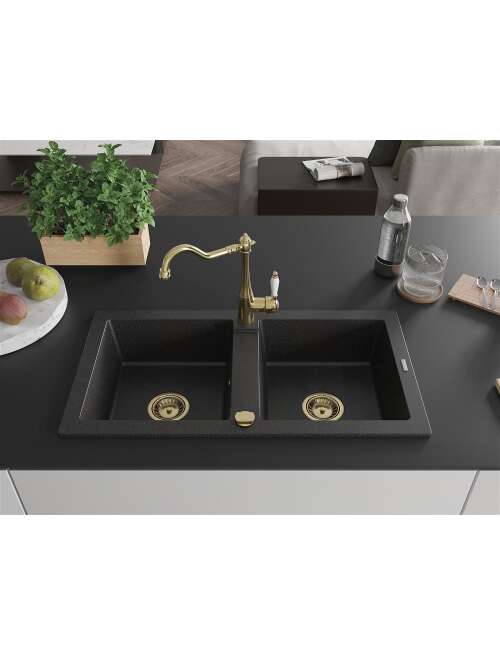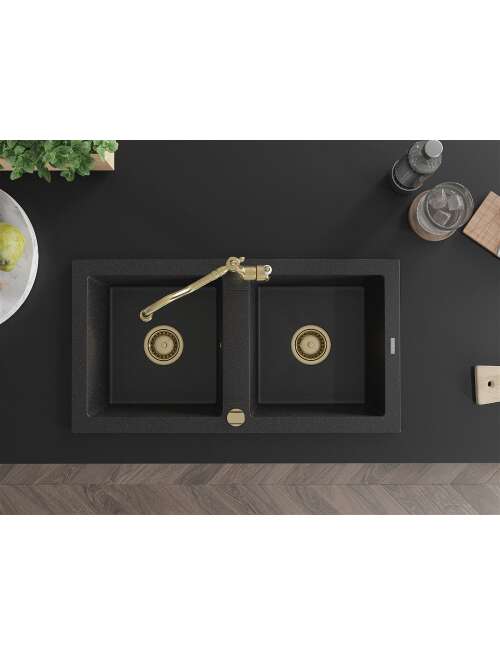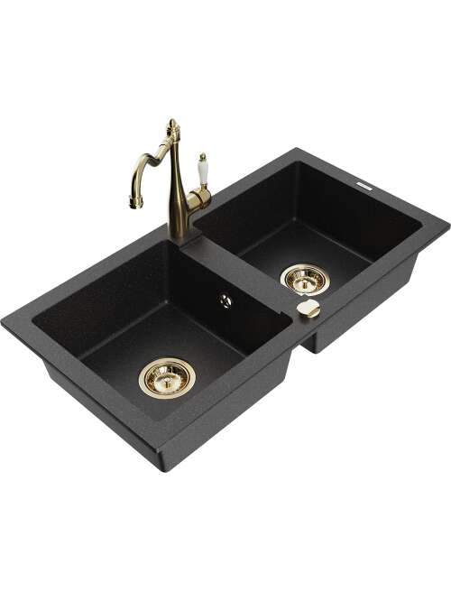 Mexen Mario zlewozmywak granitowy 2-komorowy z baterią kuchenną Carla, czarny/srebrny metalik - 6504-73-670700-50