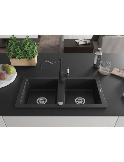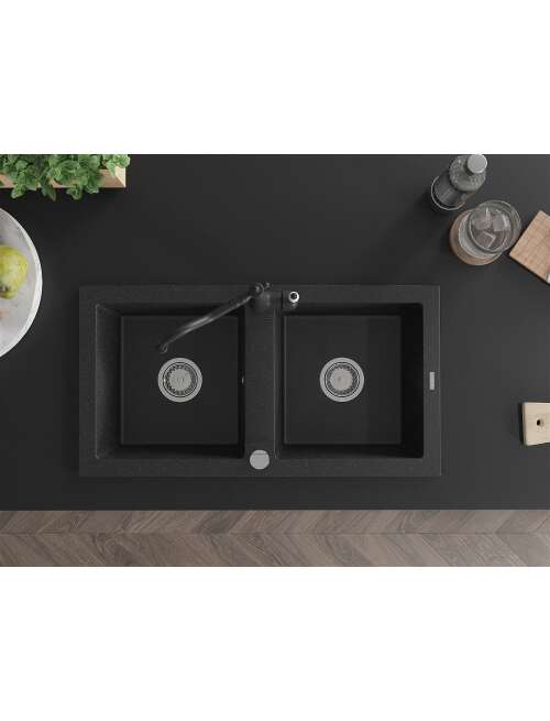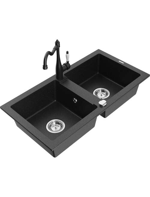 Dane techniczne: Zlewozmywak: Rozmiar: 820x436x161 mm Głębokość komory: 151 mm Wymiary komory: 356x336 mm Średnica odpływu: ø90 mm Typ: 2-komorowy Rodzaj: Wpuszczany w blat Kolor: Czarny/Srebrny metalik Wykończenie syfonu: Chrom Materiał: Granit (80% kruszywo granitowe 20% żywice) Otwór przelewowy: Tak Otwory: ( bateria, automat ) 2 Wysoka odporność na zarysowania i przebarwienia Odporność na szok termiczny Powierzchnia ułatwiająca czyszczenie Bateria kuchenna: Materiał: Mosiądz Kolor: Czarny Głowica: Ceramiczna Perlator: Tak Typ: Jednouchwytowa Wysokość baterii: 290 mm Zasięg wylewki: 260 mm |