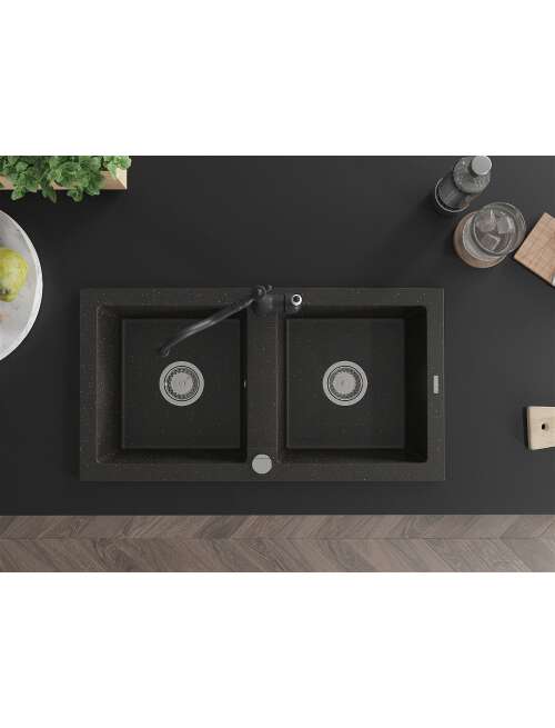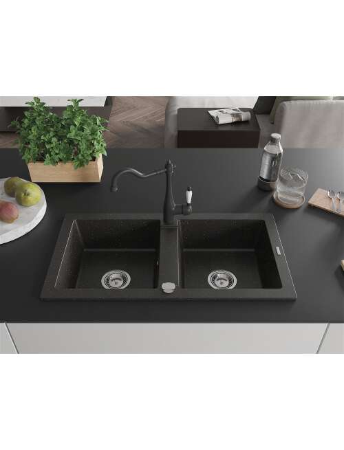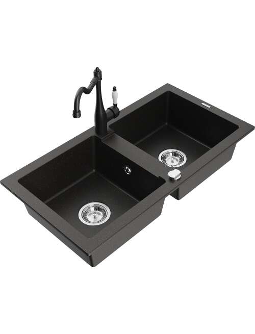 Mexen Mario zlewozmywak granitowy 2-komorowy z baterią kuchenną Carla, czarny/złoty metalik - 6504-75-670700-70