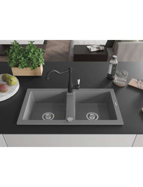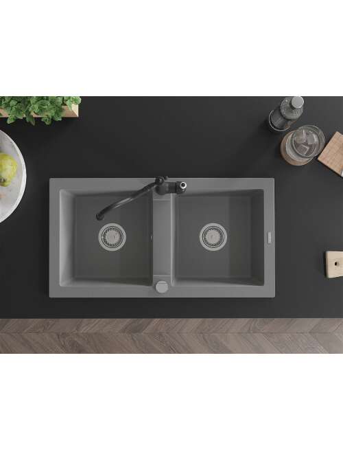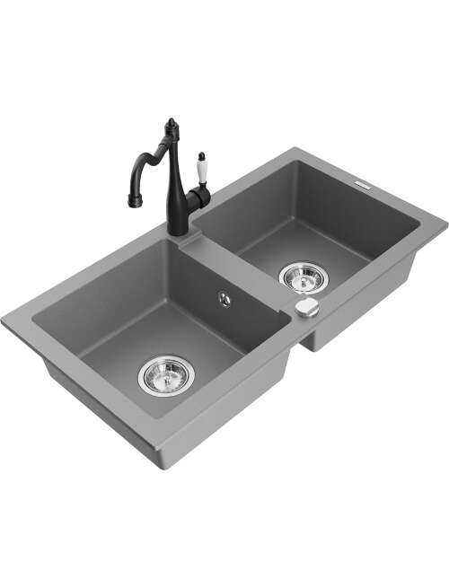 Mexen Mario zlewozmywak granitowy 2-komorowy z baterią kuchenną Carla, szary - 6504-71-670700-70