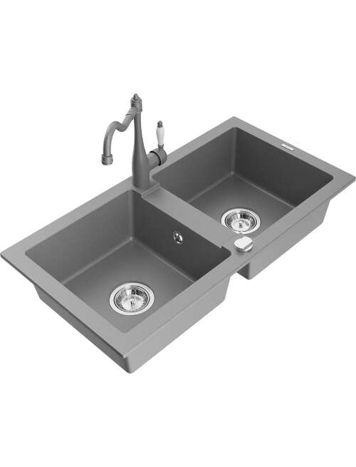 Mexen Mario zlewozmywak granitowy 2-komorowy z baterią kuchenną Carla, szary - 6504-71-670700-71