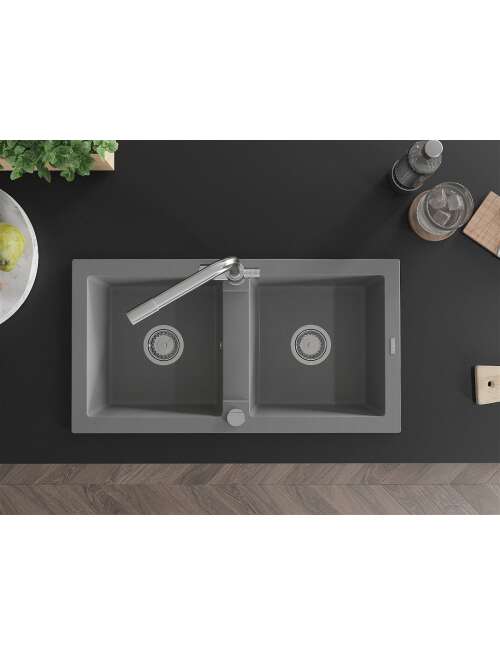 Dane techniczne: Zlewozmywak: Rozmiar: 820x436x161 mm Głębokość komory: 151 mm Wymiary komory: 356x336 mm Średnica odpływu: ø90 mm Typ: 2-komorowy Rodzaj: Wpuszczany w blat Kolor: Szary Wykończenie syfonu: Chrom Materiał: Granit (80% kruszywo granitowe 20% żywice) Otwór przelewowy: Tak Otwory: ( bateria, automat ) 2 Wysoka odporność na zarysowania i przebarwienia Odporność na szok termiczny Powierzchnia ułatwiająca czyszczenie Bateria kuchenna: Materiał: Mosiądz Kolor: Chrom Głowica: Ceramiczna Perlator: Tak Typ: Dwuuchwytowa Zasięg wylewki: 235 mm Wysokość baterii: 315 mm Bateria dwugłowicowa z dodatkowym filtrem do wody pitnej |