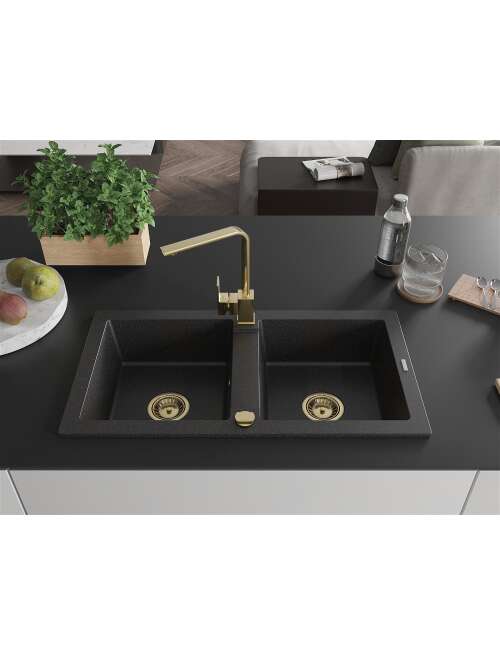 Mexen Mario zlewozmywak granitowy 2-komorowy z baterią kuchenną Rita, czarny/srebrny metalik - 6504-73-670300-50