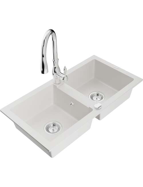Dane techniczne: Zlewozmywak: Rozmiar: 820x436x161 mm Głębokość komory: 151 mm Wymiary komory: 356x336 mm Średnica odpływu: ø90 mm Typ: 2-komorowy Rodzaj: Wpuszczany w blat Kolor: Biały Wykończenie syfonu: Chrom Materiał: Granit (80% kruszywo granitowe 20% żywice) Otwór przelewowy: Tak Otwory: ( bateria, automat ) 2 Wysoka odporność na zarysowania i przebarwienia Odporność na szok termiczny Powierzchnia ułatwiająca czyszczenie Bateria kuchenna: Materiał: Mosiądz Kolor: Chrom Głowica: Ceramiczna Perlator: Tak Typ: Jednouchwytowa Wysokość baterii: 410 mm Zasięg wylewki: 231 mm |
