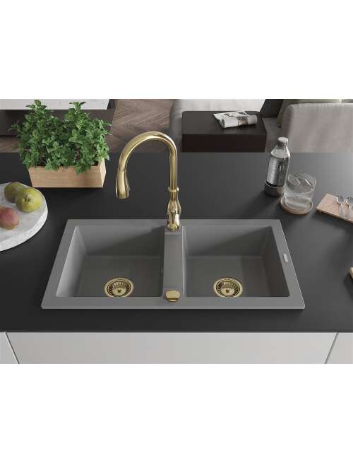 Dane techniczne: Zlewozmywak: Rozmiar: 820x436x161 mm Głębokość komory: 151 mm Wymiary komory: 356x336 mm Średnica odpływu: ø90 mm Typ: 2-komorowy Rodzaj: Wpuszczany w blat Kolor: Szary Wykończenie syfonu: Złoty Materiał: Granit (80% kruszywo granitowe 20% żywice) Otwór przelewowy: Tak Otwory: ( bateria, automat ) 2 Wysoka odporność na zarysowania i przebarwienia Odporność na szok termiczny Powierzchnia ułatwiająca czyszczenie Bateria kuchenna: Materiał: Mosiądz Kolor: Złoty Głowica: Ceramiczna Perlator: Tak Typ: Jednouchwytowa Wysokość baterii: 410 mm Zasięg wylewki: 231 mm |