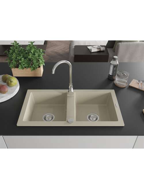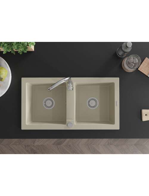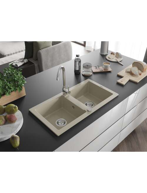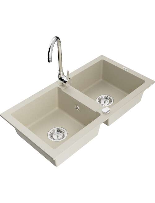 Dane techniczne: Zlewozmywak: Rozmiar: 820x436x161 mm Głębokość komory: 151 mm Wymiary komory: 356x336 mm Średnica odpływu: ø90 mm Typ: 2-komorowy Rodzaj: Wpuszczany w blat Kolor: Beżowy Wykończenie syfonu: Chrom Materiał: Granit (80% kruszywo granitowe 20% żywice) Otwór przelewowy: Tak Otwory: ( bateria, automat ) 2 Wysoka odporność na zarysowania i przebarwienia Odporność na szok termiczny Powierzchnia ułatwiająca czyszczenie Bateria kuchenna: Materiał: Mosiądz Kolor: Chrom Głowica: Ceramiczna Perlator: Tak Typ: Jednouchwytowa Wysokość baterii: 335 mm Zasięg wylewki: 180 mm |
