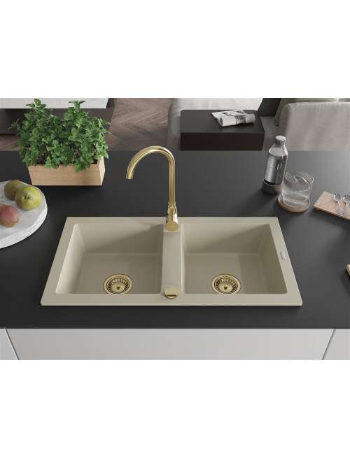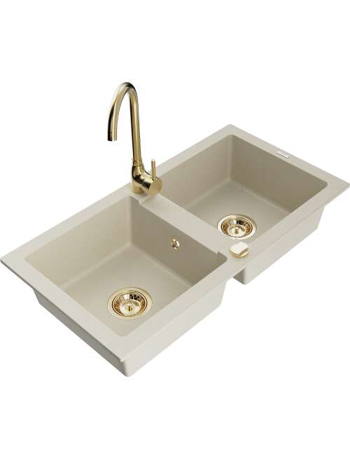 Dane techniczne: Zlewozmywak: Rozmiar: 820x436x161 mm Głębokość komory: 151 mm Wymiary komory: 356x336 mm Średnica odpływu: ø90 mm Typ: 2-komorowy Rodzaj: Wpuszczany w blat Kolor: Beżowy Wykończenie syfonu: Złoty Materiał: Granit (80% kruszywo granitowe 20% żywice) Otwór przelewowy: Tak Otwory: ( bateria, automat ) 2 Wysoka odporność na zarysowania i przebarwienia Odporność na szok termiczny Powierzchnia ułatwiająca czyszczenie Bateria kuchenna: Materiał: Mosiądz Kolor: Złoty Głowica: Ceramiczna Perlator: Tak Typ: Jednouchwytowa Wysokość baterii: 335 mm Zasięg wylewki: 180 mm |