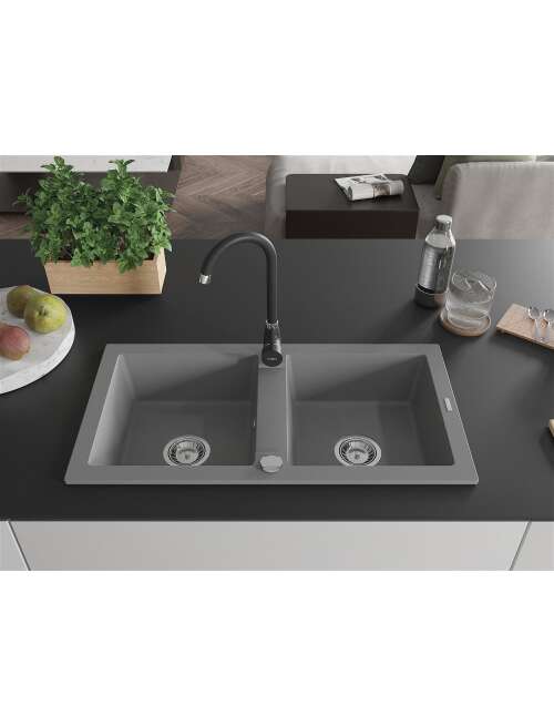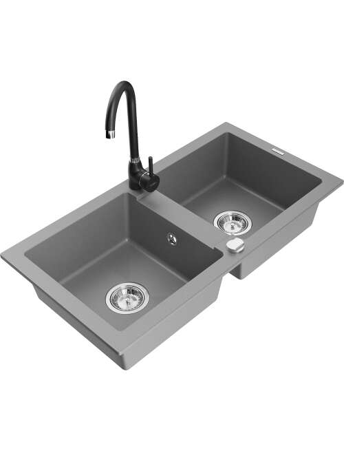 Dane techniczne: Zlewozmywak: Rozmiar: 820x436x161 mm Głębokość komory: 151 mm Wymiary komory: 356x336 mm Średnica odpływu: ø90 mm Typ: 2-komorowy Rodzaj: Wpuszczany w blat Kolor: Szary Wykończenie syfonu: Chrom Materiał: Granit (80% kruszywo granitowe 20% żywice) Otwór przelewowy: Tak Otwory: ( bateria, automat ) 2 Wysoka odporność na zarysowania i przebarwienia Odporność na szok termiczny Powierzchnia ułatwiająca czyszczenie Bateria kuchenna: Materiał: Mosiądz Kolor: Czarny Głowica: Ceramiczna Perlator: Tak Typ: Jednouchwytowa Wysokość baterii: 335 mm Zasięg wylewki: 180 mm |