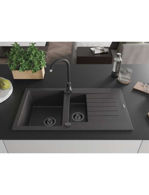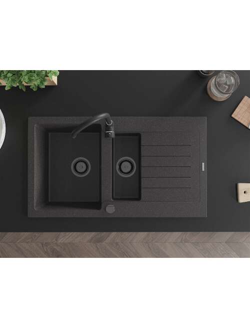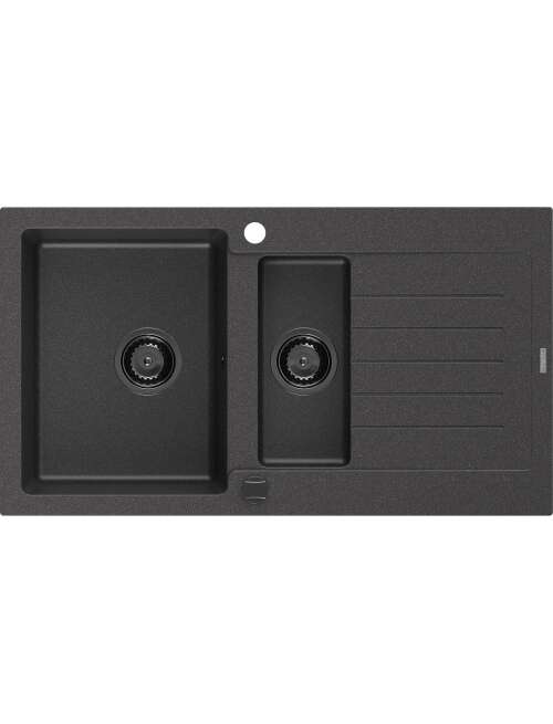 Dane techniczne: Rozmiar: 900x505x200 mm Głębokość komory: 180 mm (większa), 115 mm (mniejsza) Wymiary komory: 435x335 mm (większa), 345x150 mm (mniejsza) Średnica odpływu: ø90 mm Rodzaj: 1,5-komorowy z krótkim ociekaczem Typ: Wpuszczany w blat Materiał: Granit Kolor: Czarny nakrapiany Wykończenie syfonu: Czarny Otwór przelewowy: Tak Otwór na baterie: Tak Syfon automatyczny w komplecie Wysoka odporność na zarysowania i przebarwienia Odporność na szok termiczny Powierzchnia ułatwiająca czyszczenie Dwa dodatkowe podfrezowane otwory do samodzielnego wybicia ø35 |