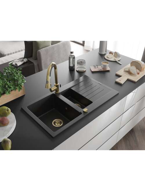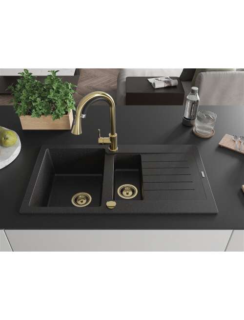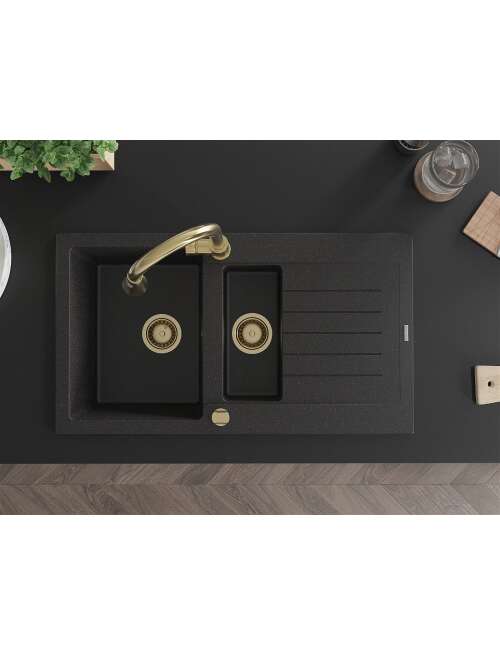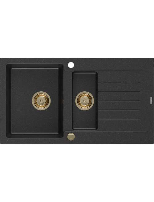 Dane techniczne: Rozmiar: 900x505x200 mm Głębokość komory: 180 mm (większa), 115 mm (mniejsza) Wymiary komory: 435x335 mm (większa), 345x150 mm (mniejsza) Średnica odpływu: ø90 mm Rodzaj: 1,5-komorowy z krótkim ociekaczem Typ: Wpuszczany w blat Materiał: Granit Kolor: Czarny/Srebrny metalik Wykończenie syfonu: Złoty Otwór przelewowy: Tak Otwór na baterie: Tak Syfon automatyczny w komplecie Wysoka odporność na zarysowania i przebarwienia Odporność na szok termiczny Powierzchnia ułatwiająca czyszczenie Dwa dodatkowe podfrezowane otwory do samodzielnego wybicia ø35 |