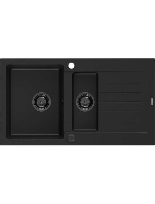 Dane techniczne: Rozmiar: 900x505x200 mm Głębokość komory: 180 mm (większa), 115 mm (mniejsza) Wymiary komory: 435x335 mm (większa), 345x150 mm (mniejsza) Średnica odpływu: ø90 mm Rodzaj: 1,5-komorowy z krótkim ociekaczem Typ: Wpuszczany w blat Materiał: Granit Kolor: Czarny Wykończenie syfonu: Czarny Otwór przelewowy: Tak Otwór na baterie: Tak Syfon automatyczny w komplecie Wysoka odporność na zarysowania i przebarwienia Odporność na szok termiczny Powierzchnia ułatwiająca czyszczenie Dwa dodatkowe podfrezowane otwory do samodzielnego wybicia ø35 |