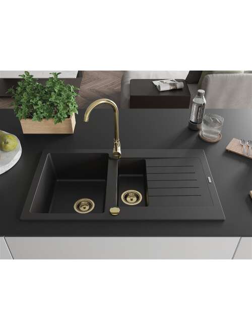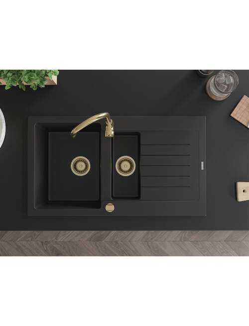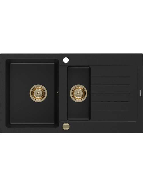 Mexen Matias zlewozmywak granitowy 1,5-komorowy z ociekaczem 900 x 505 mm, czarny, syfon złoty - 6502901505-77-G