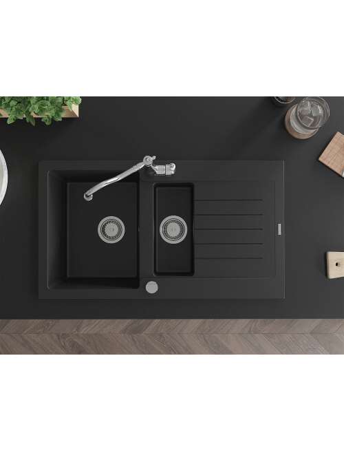 Dane techniczne: Zlewozmywak: Rozmiar: 900x505x200 mm Głębokość komory: 180 mm (większa), 115 mm (mniejsza) Wymiary komory: 435x335 mm (większa), 345x150 mm (mniejsza) Średnica odpływu: ø90 mm Typ: 1,5-komorowy z krótkim ociekaczem Rodzaj: Wpuszczany w blat Kolor: Czarny Wykończenie syfonu: Chrom Materiał: Granit (80% kruszywo granitowe 20% żywice) Otwór przelewowy: Tak Otwory: ( bateria, automat ) 2 Montaż: Uniwersalny, możliwość montażu z ociekaczem po lewej lub prawej stronie Wysoka odporność na zarysowania i przebarwienia Odporność na szok termiczny Powierzchnia ułatwiająca czyszczenie Dwa dodatkowe podfrezowane otwory do samodzielnego wybicia ø35 Bateria kuchenna: Materiał: Mosiądz Kolor: Chrom Głowica: Ceramiczna Perlator: Tak Typ: Jednouchwytowa Wysokość baterii: 290 mm Zasięg wylewki: 260 mm |