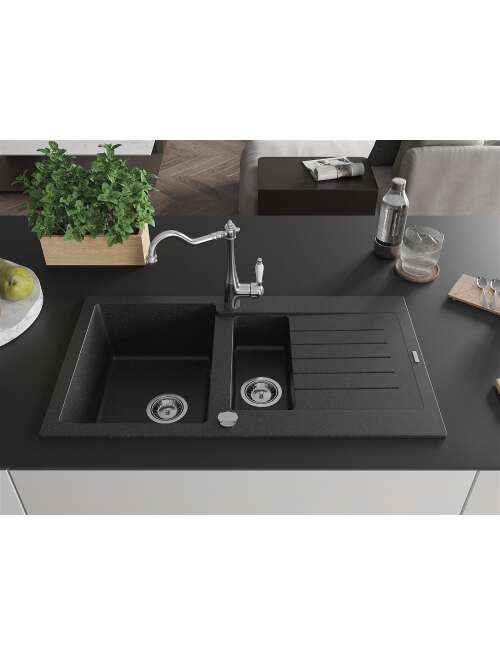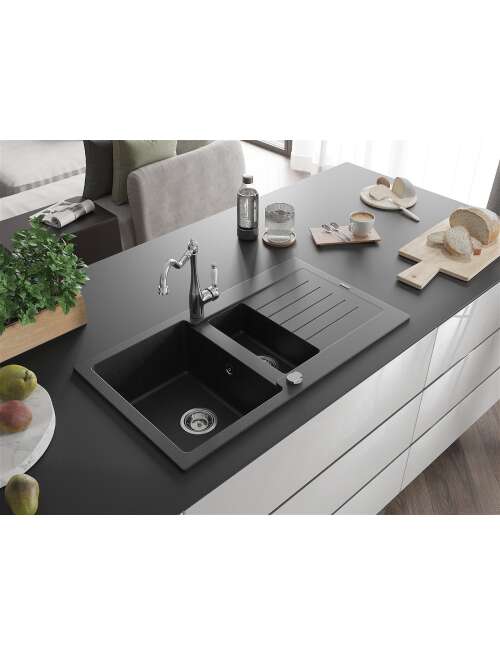 Dane techniczne: Zlewozmywak: Rozmiar: 900x505x200 mm Głębokość komory: 180 mm (większa), 115 mm (mniejsza) Wymiary komory: 435x335 mm (większa), 345x150 mm (mniejsza) Średnica odpływu: ø90 mm Typ: 1,5-komorowy z krótkim ociekaczem Rodzaj: Wpuszczany w blat Kolor: Czarny/Srebrny metalik Wykończenie syfonu: Chrom Materiał: Granit (80% kruszywo granitowe 20% żywice) Otwór przelewowy: Tak Otwory: ( bateria, automat ) 2 Montaż: Uniwersalny, możliwość montażu z ociekaczem po lewej lub prawej stronie Wysoka odporność na zarysowania i przebarwienia Odporność na szok termiczny Powierzchnia ułatwiająca czyszczenie Dwa dodatkowe podfrezowane otwory do samodzielnego wybicia ø35 Bateria kuchenna: Materiał: Mosiądz Kolor: Chrom Głowica: Ceramiczna Perlator: Tak Typ: Jednouchwytowa Wysokość baterii: 290 mm Zasięg wylewki: 260 mm |