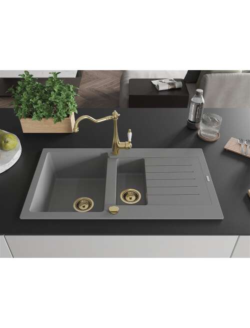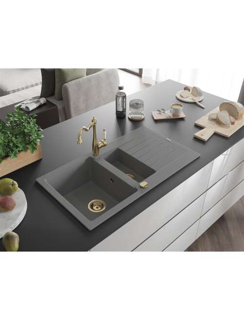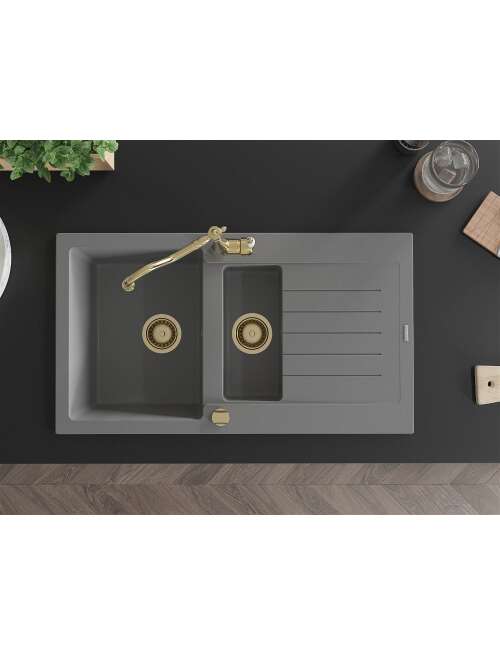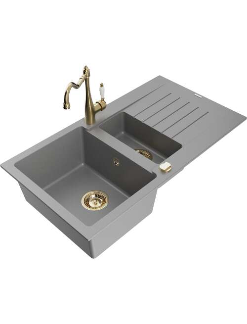 Dane techniczne: Zlewozmywak: Rozmiar: 900x505x200 mm Głębokość komory: 180 mm (większa), 115 mm (mniejsza) Wymiary komory: 435x335 mm (większa), 345x150 mm (mniejsza) Średnica odpływu: ø90 mm Typ: 1,5-komorowy z krótkim ociekaczem Rodzaj: Wpuszczany w blat Kolor: Szary Wykończenie syfonu: Złoty Materiał: Granit (80% kruszywo granitowe 20% żywice) Otwór przelewowy: Tak Otwory: ( bateria, automat ) 2 Montaż: Uniwersalny, możliwość montażu z ociekaczem po lewej lub prawej stronie Wysoka odporność na zarysowania i przebarwienia Odporność na szok termiczny Powierzchnia ułatwiająca czyszczenie Dwa dodatkowe podfrezowane otwory do samodzielnego wybicia ø35 Bateria kuchenna: Materiał: Mosiądz Kolor: Złoty Głowica: Ceramiczna Perlator: Tak Typ: Jednouchwytowa Wysokość baterii: 290 mm Zasięg wylewki: 260 mm |