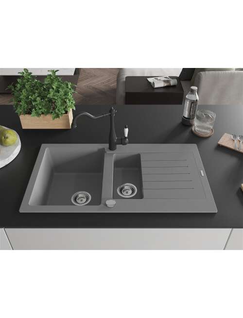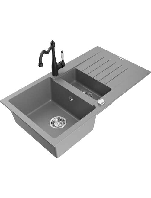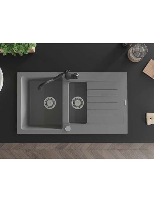 Dane techniczne: Zlewozmywak: Rozmiar: 900x505x200 mm Głębokość komory: 180 mm (większa), 115 mm (mniejsza) Wymiary komory: 435x335 mm (większa), 345x150 mm (mniejsza) Średnica odpływu: ø90 mm Typ: 1,5-komorowy z krótkim ociekaczem Rodzaj: Wpuszczany w blat Kolor: Szary Wykończenie syfonu: Chrom Materiał: Granit (80% kruszywo granitowe 20% żywice) Otwór przelewowy: Tak Otwory: ( bateria, automat ) 2 Montaż: Uniwersalny, możliwość montażu z ociekaczem po lewej lub prawej stronie Wysoka odporność na zarysowania i przebarwienia Odporność na szok termiczny Powierzchnia ułatwiająca czyszczenie Dwa dodatkowe podfrezowane otwory do samodzielnego wybicia ø35 Bateria kuchenna: Materiał: Mosiądz Kolor: Czarny Głowica: Ceramiczna Perlator: Tak Typ: Jednouchwytowa Wysokość baterii: 290 mm Zasięg wylewki: 260 mm |