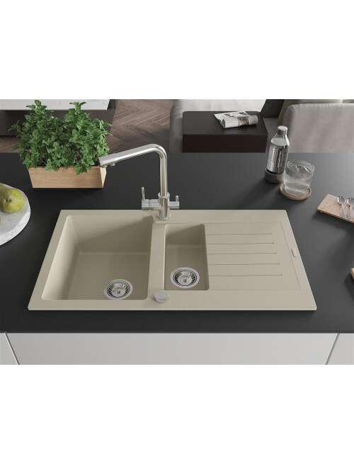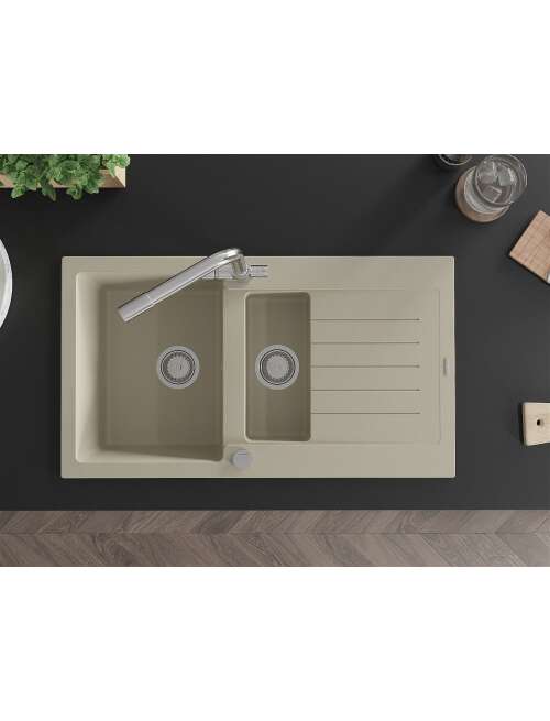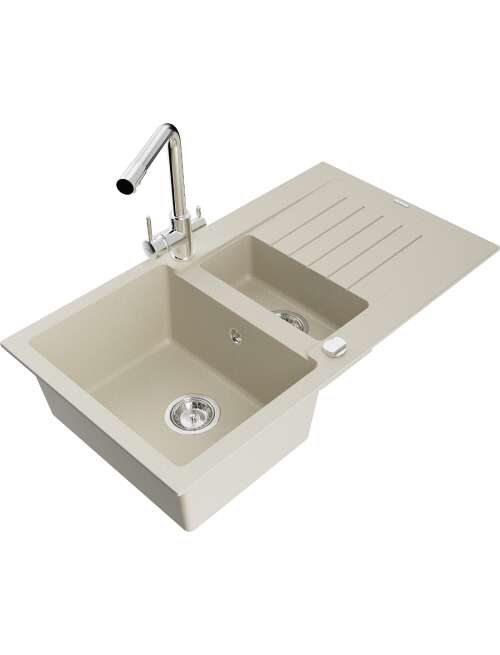 Dane techniczne: Zlewozmywak: Rozmiar: 900x505x200 mm Głębokość komory: 180 mm (większa), 115 mm (mniejsza) Wymiary komory: 435x335 mm (większa), 345x150 mm (mniejsza) Średnica odpływu: ø90 mm Typ: 1,5-komorowy z krótkim ociekaczem Rodzaj: Wpuszczany w blat Kolor: Beżowy Wykończenie syfonu: Chrom Materiał: Granit (80% kruszywo granitowe 20% żywice) Otwór przelewowy: Tak Otwory: ( bateria, automat ) 2 Montaż: Uniwersalny, możliwość montażu z ociekaczem po lewej lub prawej stronie Wysoka odporność na zarysowania i przebarwienia Odporność na szok termiczny Powierzchnia ułatwiająca czyszczenie Dwa dodatkowe podfrezowane otwory do samodzielnego wybicia ø35 Bateria kuchenna: Materiał: Mosiądz Kolor: Chrom Głowica: Ceramiczna Perlator: Tak Typ: Dwuuchwytowa Zasięg wylewki: 235 mm Wysokość baterii: 315 mm Bateria dwugłowicowa z dodatkowym filtrem do wody pitnej |