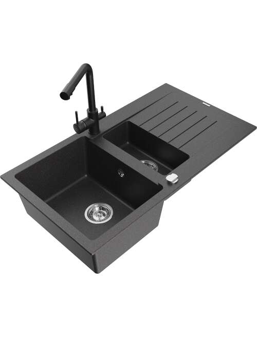 Mexen Matias zlewozmywak granitowy 1,5-komorowy z ociekaczem i baterią kuchenną Duero, czarny nakrapiany - 6502-76-671600-70