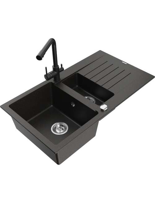 Mexen Matias zlewozmywak granitowy 1,5-komorowy z ociekaczem i baterią kuchenną Duero, czarny/złoty metalik - 6502-75-671600-70