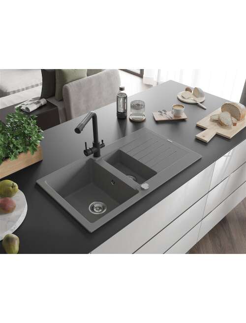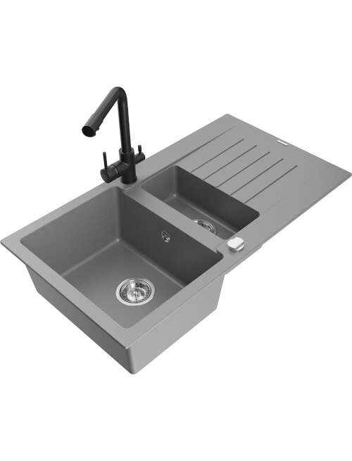 Dane techniczne: Zlewozmywak: Rozmiar: 900x505x200 mm Głębokość komory: 180 mm (większa), 115 mm (mniejsza) Wymiary komory: 435x335 mm (większa), 345x150 mm (mniejsza) Średnica odpływu: ø90 mm Typ: 1,5-komorowy z krótkim ociekaczem Rodzaj: Wpuszczany w blat Kolor: Szary Wykończenie syfonu: Chrom Materiał: Granit (80% kruszywo granitowe 20% żywice) Otwór przelewowy: Tak Otwory: ( bateria, automat ) 2 Montaż: Uniwersalny, możliwość montażu z ociekaczem po lewej lub prawej stronie Wysoka odporność na zarysowania i przebarwienia Odporność na szok termiczny Powierzchnia ułatwiająca czyszczenie Dwa dodatkowe podfrezowane otwory do samodzielnego wybicia ø35 Bateria kuchenna: Materiał: Mosiądz Kolor: Czarny Głowica: Ceramiczna Perlator: Tak Typ: Dwuuchwytowa Zasięg wylewki: 235 mm Wysokość baterii: 315 mm Bateria dwugłowicowa z dodatkowym filtrem do wody pitnej |