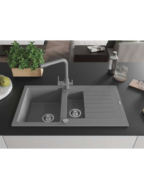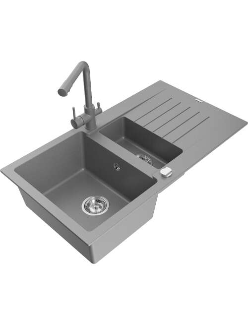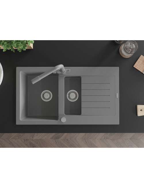 Mexen Matias zlewozmywak granitowy 1,5-komorowy z ociekaczem i baterią kuchenną Duero, szary - 6502-71-671600-71