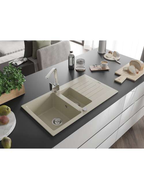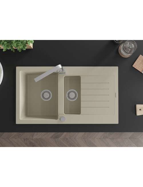 Dane techniczne: Zlewozmywak: Rozmiar: 900x505x200 mm Głębokość komory: 180 mm (większa), 115 mm (mniejsza) Wymiary komory: 435x335 mm (większa), 345x150 mm (mniejsza) Średnica odpływu: ø90 mm Typ: 1,5-komorowy z krótkim ociekaczem Rodzaj: Wpuszczany w blat Kolor: Beżowy Wykończenie syfonu: Chrom Materiał: Granit (80% kruszywo granitowe 20% żywice) Otwór przelewowy: Tak Otwory: ( bateria, automat ) 2 Montaż: Uniwersalny, możliwość montażu z ociekaczem po lewej lub prawej stronie Wysoka odporność na zarysowania i przebarwienia Odporność na szok termiczny Powierzchnia ułatwiająca czyszczenie Dwa dodatkowe podfrezowane otwory do samodzielnego wybicia ø35 Bateria kuchenna: Materiał: Mosiądz Kolor: Chrom Głowica: Ceramiczna Perlator: Tak Typ: Jednouchwytowa Wysokość baterii: 290 mm Zasięg wylewki: 220 mm |