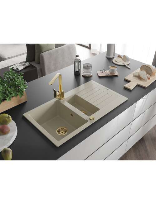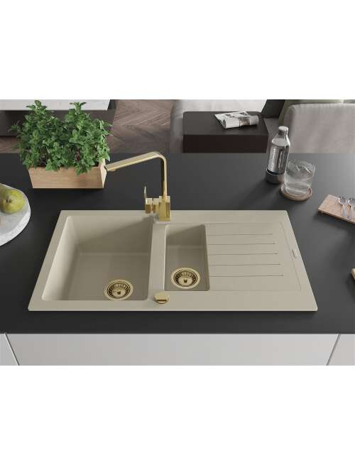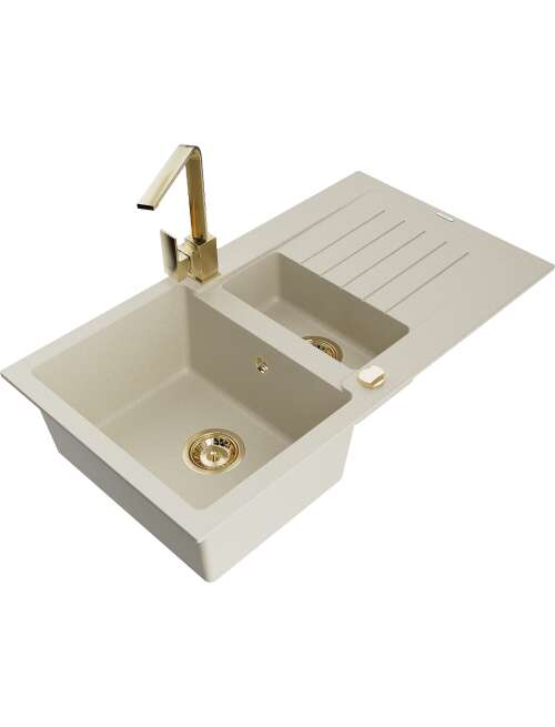 Dane techniczne: Zlewozmywak: Rozmiar: 900x505x200 mm Głębokość komory: 180 mm (większa), 115 mm (mniejsza) Wymiary komory: 435x335 mm (większa), 345x150 mm (mniejsza) Średnica odpływu: ø90 mm Typ: 1,5-komorowy z krótkim ociekaczem Rodzaj: Wpuszczany w blat Kolor: Beżowy Wykończenie syfonu: Złoty Materiał: Granit (80% kruszywo granitowe 20% żywice) Otwór przelewowy: Tak Otwory: ( bateria, automat ) 2 Montaż: Uniwersalny, możliwość montażu z ociekaczem po lewej lub prawej stronie Wysoka odporność na zarysowania i przebarwienia Odporność na szok termiczny Powierzchnia ułatwiająca czyszczenie Dwa dodatkowe podfrezowane otwory do samodzielnego wybicia ø35 Bateria kuchenna: Materiał: Mosiądz Kolor: Złoty Głowica: Ceramiczna Perlator: Tak Typ: Jednouchwytowa Wysokość baterii: 290 mm Zasięg wylewki: 220 mm |