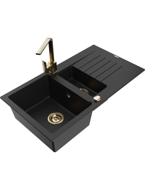 Dane techniczne: Zlewozmywak: Rozmiar: 900x505x200 mm Głębokość komory: 180 mm (większa), 115 mm (mniejsza) Wymiary komory: 435x335 mm (większa), 345x150 mm (mniejsza) Średnica odpływu: ø90 mm Typ: 1,5-komorowy z krótkim ociekaczem Rodzaj: Wpuszczany w blat Kolor: Czarny Wykończenie syfonu: Złoty Materiał: Granit (80% kruszywo granitowe 20% żywice) Otwór przelewowy: Tak Otwory: ( bateria, automat ) 2 Montaż: Uniwersalny, możliwość montażu z ociekaczem po lewej lub prawej stronie Wysoka odporność na zarysowania i przebarwienia Odporność na szok termiczny Powierzchnia ułatwiająca czyszczenie Dwa dodatkowe podfrezowane otwory do samodzielnego wybicia ø35 Bateria kuchenna: Materiał: Mosiądz Kolor: Złoty Głowica: Ceramiczna Perlator: Tak Typ: Jednouchwytowa Wysokość baterii: 290 mm Zasięg wylewki: 220 mm |