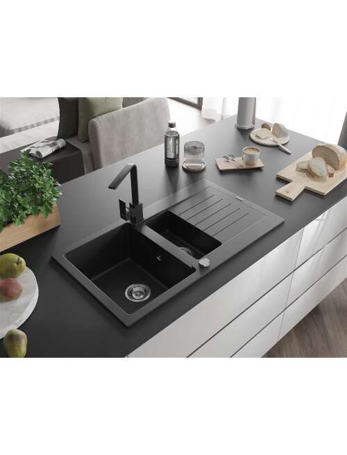 Dane techniczne: Zlewozmywak: Rozmiar: 900x505x200 mm Głębokość komory: 180 mm (większa), 115 mm (mniejsza) Wymiary komory: 435x335 mm (większa), 345x150 mm (mniejsza) Średnica odpływu: ø90 mm Typ: 1,5-komorowy z krótkim ociekaczem Rodzaj: Wpuszczany w blat Kolor: Czarny Wykończenie syfonu: Chrom Materiał: Granit (80% kruszywo granitowe 20% żywice) Otwór przelewowy: Tak Otwory: ( bateria, automat ) 2 Montaż: Uniwersalny, możliwość montażu z ociekaczem po lewej lub prawej stronie Wysoka odporność na zarysowania i przebarwienia Odporność na szok termiczny Powierzchnia ułatwiająca czyszczenie Dwa dodatkowe podfrezowane otwory do samodzielnego wybicia ø35 Bateria kuchenna: Materiał: Mosiądz Kolor: Czarny Głowica: Ceramiczna Perlator: Tak Typ: Jednouchwytowa Wysokość baterii: 290 mm Zasięg wylewki: 220 mm |