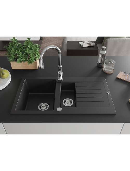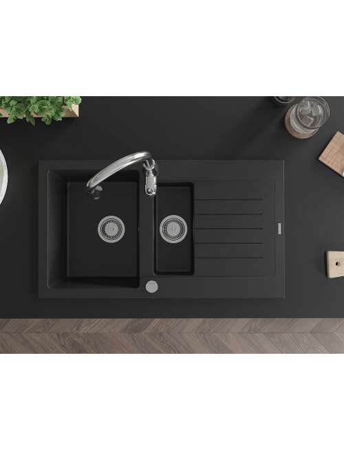Dane techniczne: Zlewozmywak: Rozmiar: 900x505x200 mm Głębokość komory: 180 mm (większa), 115 mm (mniejsza) Wymiary komory: 435x335 mm (większa), 345x150 mm (mniejsza) Średnica odpływu: ø90 mm Typ: 1,5-komorowy z krótkim ociekaczem Rodzaj: Wpuszczany w blat Kolor: Czarny Wykończenie syfonu: Chrom Materiał: Granit (80% kruszywo granitowe 20% żywice) Otwór przelewowy: Tak Otwory: ( bateria, automat ) 2 Montaż: Uniwersalny, możliwość montażu z ociekaczem po lewej lub prawej stronie Wysoka odporność na zarysowania i przebarwienia Odporność na szok termiczny Powierzchnia ułatwiająca czyszczenie Dwa dodatkowe podfrezowane otwory do samodzielnego wybicia ø35 Bateria kuchenna: Materiał: Mosiądz Kolor: Chrom Głowica: Ceramiczna Perlator: Tak Wysokość baterii: 410 mm Zasięg wylewki: 231 mm |