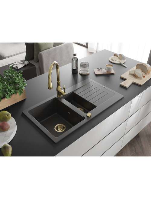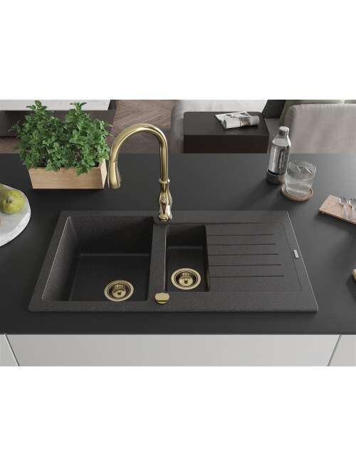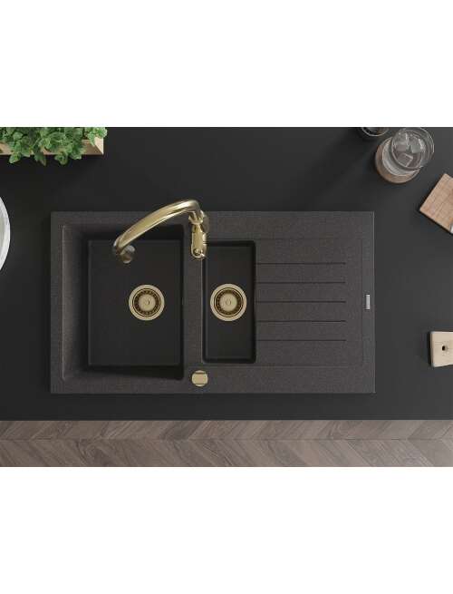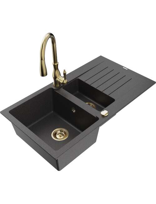 Mexen Matias zlewozmywak granitowy 1,5-komorowy z ociekaczem i baterią kuchenną Savita, czarny nakrapiany - 6502-76-672601-50