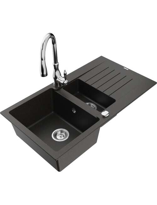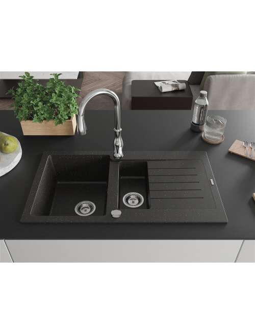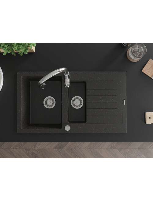 Dane techniczne: Zlewozmywak: Rozmiar: 900x505x200 mm Głębokość komory: 180 mm (większa), 115 mm (mniejsza) Wymiary komory: 435x335 mm (większa), 345x150 mm (mniejsza) Średnica odpływu: ø90 mm Typ: 1,5-komorowy z krótkim ociekaczem Rodzaj: Wpuszczany w blat Kolor: Czarny/złoty metalik Wykończenie syfonu: Chrom Materiał: Granit (80% kruszywo granitowe 20% żywice) Otwór przelewowy: Tak Otwory: ( bateria, automat ) 2 Montaż: Uniwersalny, możliwość montażu z ociekaczem po lewej lub prawej stronie Wysoka odporność na zarysowania i przebarwienia Odporność na szok termiczny Powierzchnia ułatwiająca czyszczenie Dwa dodatkowe podfrezowane otwory do samodzielnego wybicia ø35 Bateria kuchenna: Materiał: Mosiądz Kolor: Chrom Głowica: Ceramiczna Perlator: Tak Wysokość baterii: 410 mm Zasięg wylewki: 231 mm |