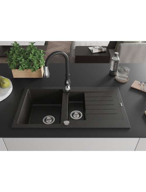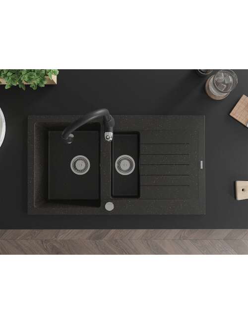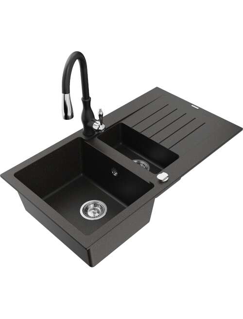 Mexen Matias zlewozmywak granitowy 1,5-komorowy z ociekaczem i baterią kuchenną Savita, czarny/złoty - 6502-75-672601-70