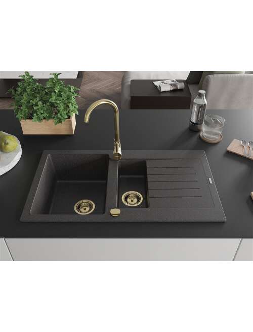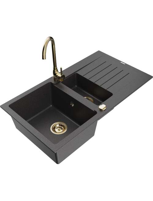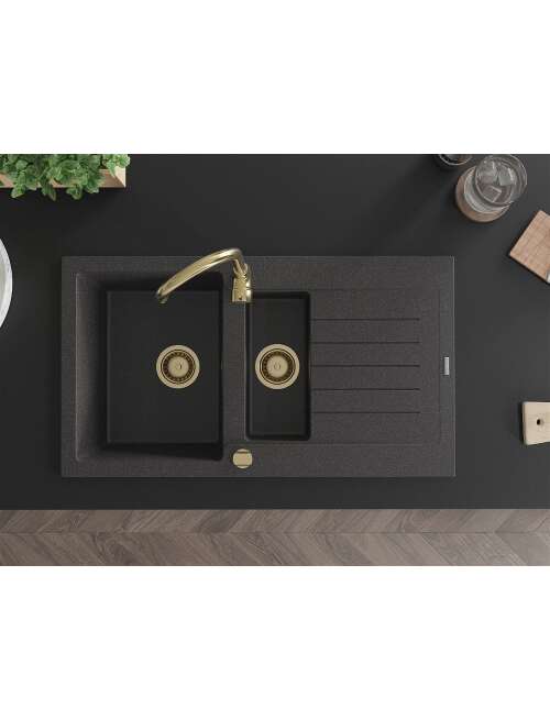 Dane techniczne: Zlewozmywak: Rozmiar: 900x505x200 mm Głębokość komory: 180 mm (większa), 115 mm (mniejsza) Wymiary komory: 435x335 mm (większa), 345x150 mm (mniejsza) Średnica odpływu: ø90 mm Typ: 1,5-komorowy z krótkim ociekaczem Rodzaj: Wpuszczany w blat Kolor: Czarny nakrapiany Wykończenie syfonu: Złoty Materiał: Granit (80% kruszywo granitowe 20% żywice) Otwór przelewowy: Tak Otwory: ( bateria, automat ) 2 Montaż: Uniwersalny, możliwość montażu z ociekaczem po lewej lub prawej stronie Wysoka odporność na zarysowania i przebarwienia Odporność na szok termiczny Powierzchnia ułatwiająca czyszczenie Dwa dodatkowe podfrezowane otwory do samodzielnego wybicia ø35 Bateria kuchenna: Materiał: Mosiądz Kolor: Złoty Głowica: Ceramiczna Perlator: Tak Typ: Jednouchwytowa Wysokość baterii: 335 mm Zasięg wylewki: 180 mm |