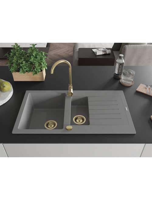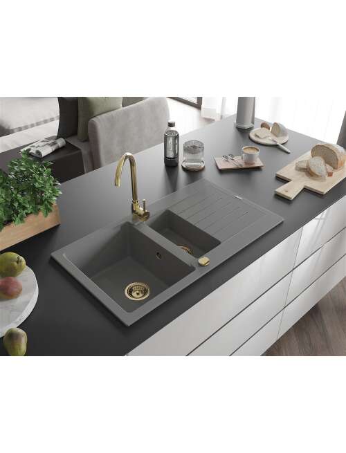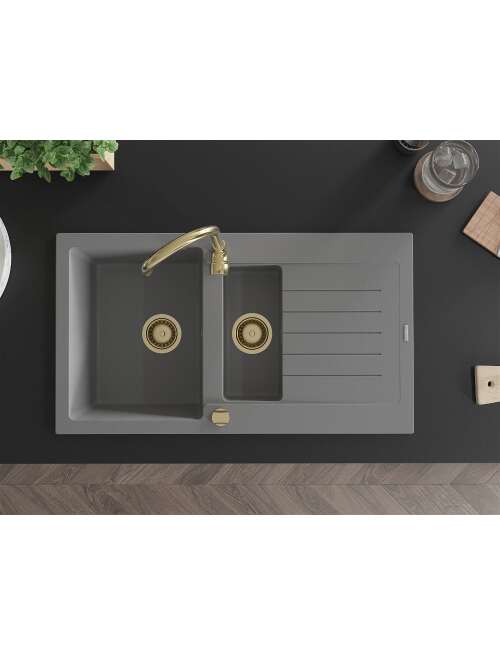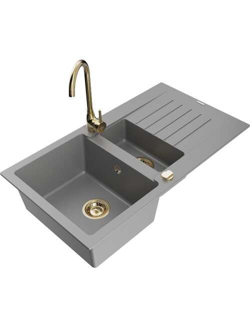 Dane techniczne: Zlewozmywak: Rozmiar: 900x505x200 mm Głębokość komory: 180 mm (większa), 115 mm (mniejsza) Wymiary komory: 435x335 mm (większa), 345x150 mm (mniejsza) Średnica odpływu: ø90 mm Typ: 1,5-komorowy z krótkim ociekaczem Rodzaj: Wpuszczany w blat Kolor: Szary Wykończenie syfonu: Złoty Materiał: Granit (80% kruszywo granitowe 20% żywice) Otwór przelewowy: Tak Otwory: ( bateria, automat ) 2 Montaż: Uniwersalny, możliwość montażu z ociekaczem po lewej lub prawej stronie Wysoka odporność na zarysowania i przebarwienia Odporność na szok termiczny Powierzchnia ułatwiająca czyszczenie Dwa dodatkowe podfrezowane otwory do samodzielnego wybicia ø35 Bateria kuchenna: Materiał: Mosiądz Kolor: Złoty Głowica: Ceramiczna Perlator: Tak Typ: Jednouchwytowa Wysokość baterii: 335 mm Zasięg wylewki: 180 mm |