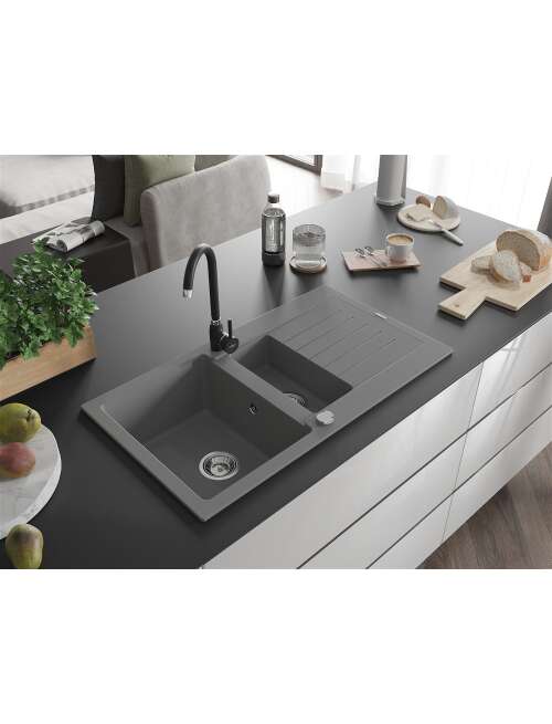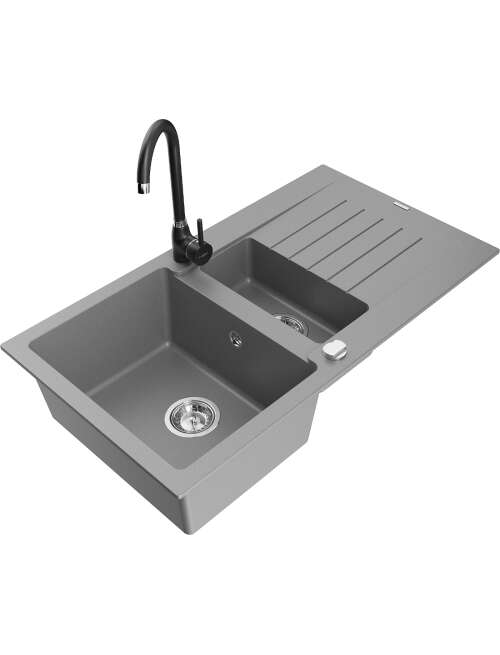 Mexen Matias zlewozmywak granitowy 1,5-komorowy z ociekaczem i baterią kuchenną Telma, szary - 6502-71-670200-70