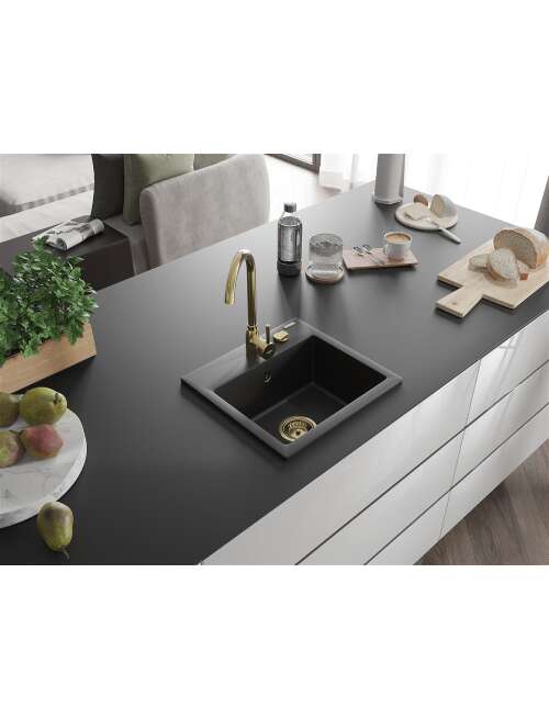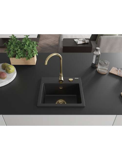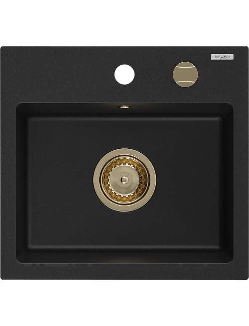 Mexen Milo zlewozmywak granitowy 1-komorowy 435 x 410 mm, czarny, syfon złoty - 6505441000-77-G