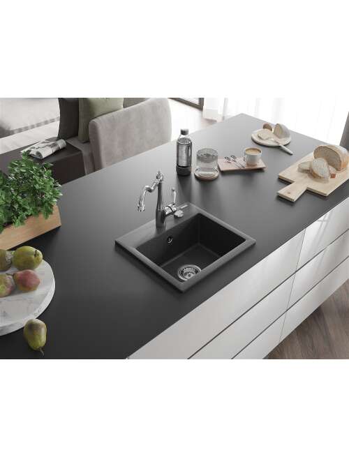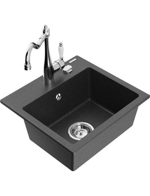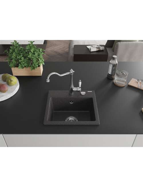 Dane techniczne: Zlewozmywak: Rozmiar: 435x410x171 mm Głębokość komory: 161 mm Wymiary komory: 375x280 mm Średnica odpływu: ø90 mm Typ: 1-komorowy Rodzaj: Wpuszczany w blat Kolor: Czarny nakrapiany Wykończenie syfonu: Chrom Materiał: Granit (80% kruszywo granitowe 20% żywice) Otwór przelewowy: Tak Otwory: ( bateria, automat ) 2 Wysoka odporność na zarysowania i przebarwienia Odporność na szok termiczny Powierzchnia ułatwiająca czyszczenie Jeden dodatkowy podfrezowany otwór do samodzielnego wybicia ø35 Bateria kuchenna: Materiał: Mosiądz Kolor: Chrom Głowica: Ceramiczna Perlator: Tak Typ: Jednouchwytowa Wysokość baterii: 290 mm Zasięg wylewki: 260 mm |
