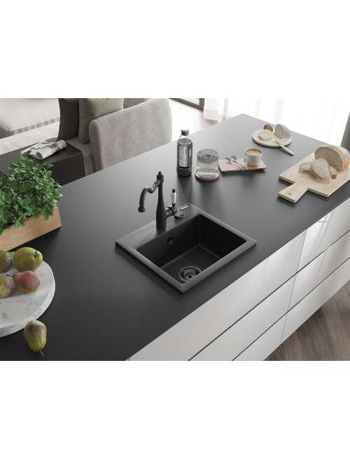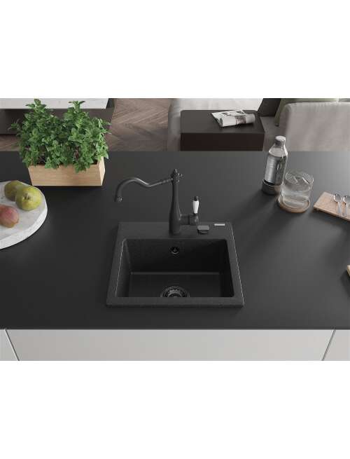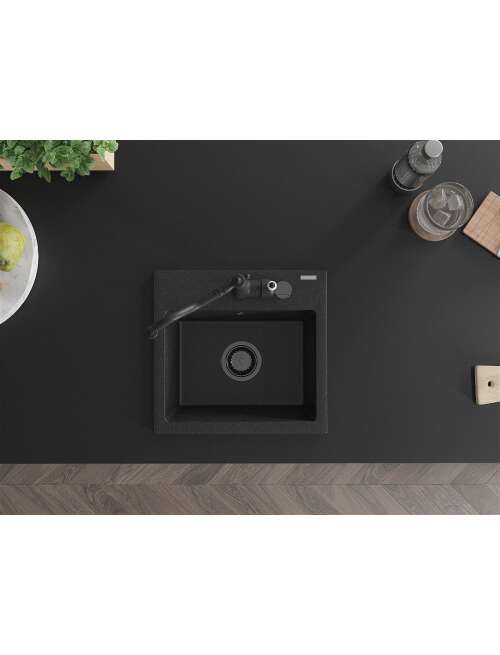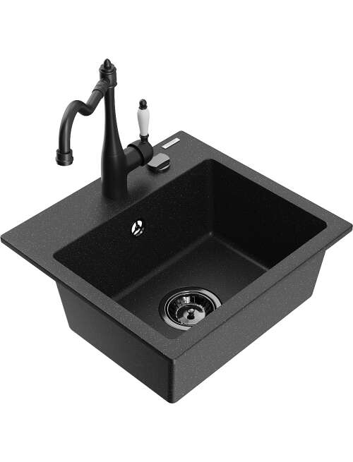 Mexen Milo zlewozmywak granitowy 1-komorowy z baterią kuchenną Carla, czarny/srebrny metalik - 6505-73-670700-70-B