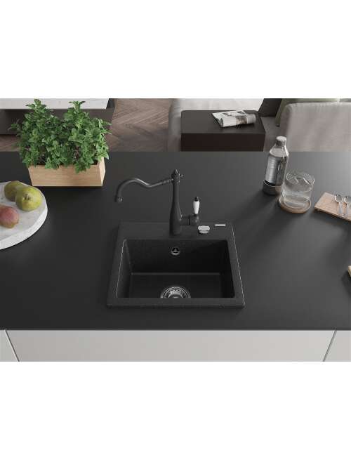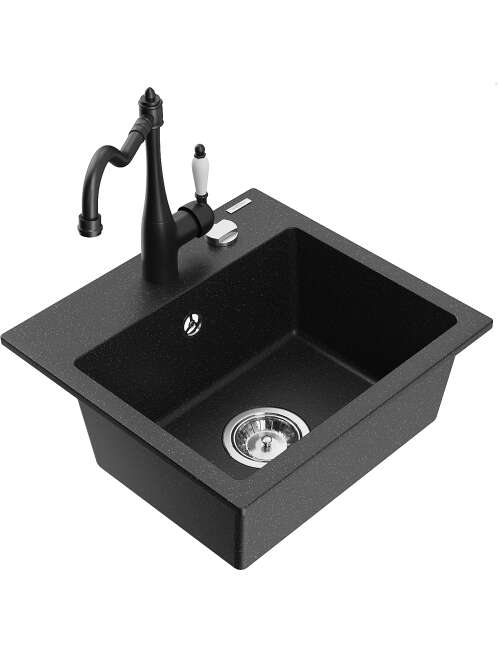 Dane techniczne: Zlewozmywak: Rozmiar: 435x410x171 mm Głębokość komory: 161 mm Wymiary komory: 375x280 mm Średnica odpływu: ø90 mm Typ: 1-komorowy Rodzaj: Wpuszczany w blat Kolor: Czarny/Srebrny metalik Wykończenie syfonu: Chrom Materiał: Granit (80% kruszywo granitowe 20% żywice) Otwór przelewowy: Tak Otwory: ( bateria, automat ) 2 Wysoka odporność na zarysowania i przebarwienia Odporność na szok termiczny Powierzchnia ułatwiająca czyszczenie Jeden dodatkowy podfrezowany otwór do samodzielnego wybicia ø35 Bateria kuchenna: Materiał: Mosiądz Kolor: Czarny Głowica: Ceramiczna Perlator: Tak Typ: Jednouchwytowa Wysokość baterii: 290 mm Zasięg wylewki: 260 mm |
