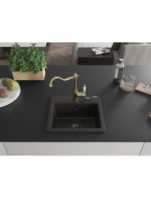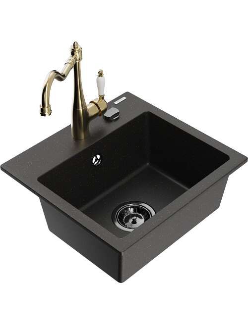 Mexen Milo zlewozmywak granitowy 1-komorowy z baterią kuchenną Carla, czarny/złoty metalik - 6505-75-670700-50-B