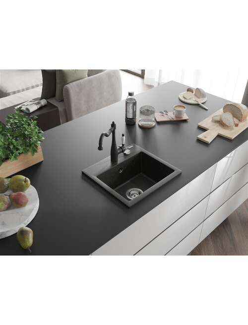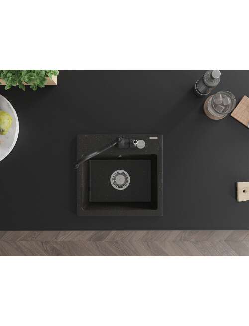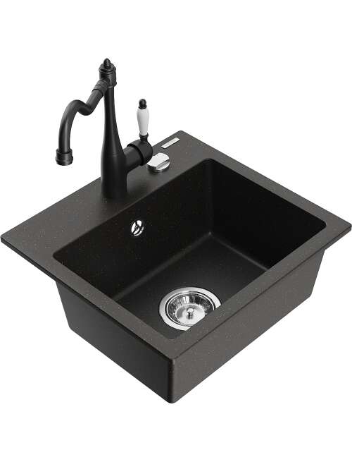 Mexen Milo zlewozmywak granitowy 1-komorowy z baterią kuchenną Carla, czarny/złoty metalik - 6505-75-670700-70