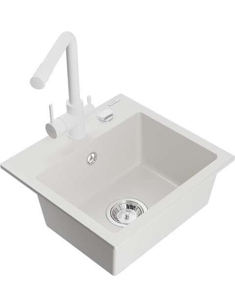 Dane techniczne: Zlewozmywak: Rozmiar: 435x410x171 mm Głębokość komory: 161 mm Wymiary komory: 375x280 mm Średnica odpływu: ø90 mm Typ: 1-komorowy Rodzaj: Wpuszczany w blat Kolor: Biały Wykończenie syfonu: Chrom Materiał: Granit (80% kruszywo granitowe 20% żywice) Otwór przelewowy: Tak Otwory: ( bateria, automat ) 2 Wysoka odporność na zarysowania i przebarwienia Odporność na szok termiczny Powierzchnia ułatwiająca czyszczenie Jeden dodatkowy podfrezowany otwór do samodzielnego wybicia ø35 Bateria kuchenna: Materiał: Mosiądz Kolor: Biały Głowica: Ceramiczna Perlator: Tak Typ: Dwuuchwytowa Zasięg wylewki: 235 mm Wysokość baterii: 315 mm Bateria dwugłowicowa z dodatkowym filtrem do wody pitnej |