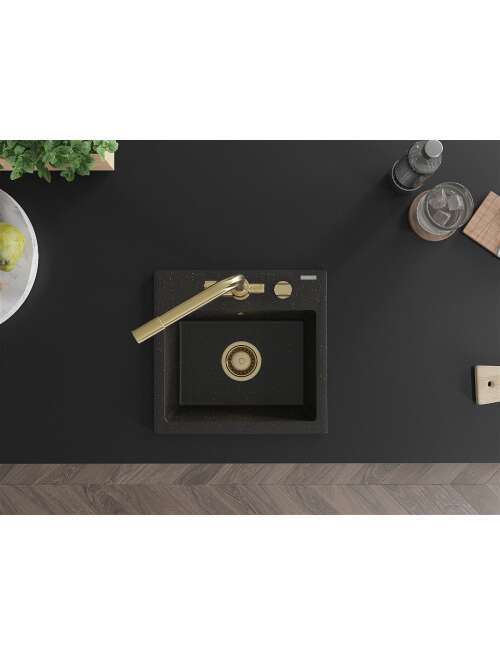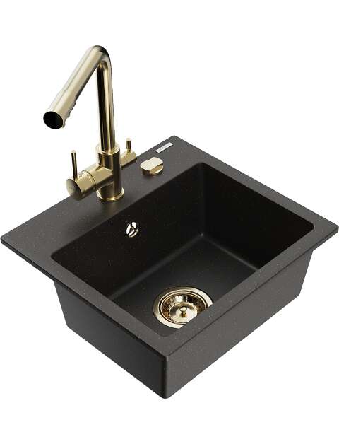 Mexen Milo zlewozmywak granitowy 1-komorowy z baterią kuchenną Duero, czarny/złoty metalik - 6505-75-671600-50