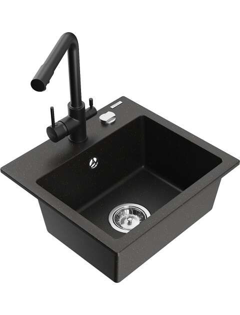 Mexen Milo zlewozmywak granitowy 1-komorowy z baterią kuchenną Duero, czarny/złoty metalik - 6505-75-671600-70