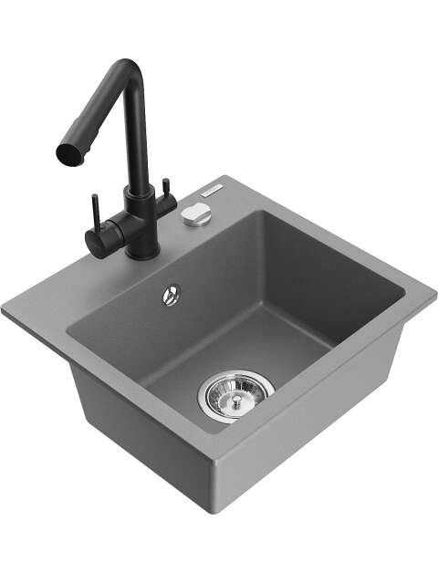 Dane techniczne: Zlewozmywak: Rozmiar: 435x410x171 mm Głębokość komory: 161 mm Wymiary komory: 375x280 mm Średnica odpływu: ø90 mm Typ: 1-komorowy Rodzaj: Wpuszczany w blat Kolor: Szary Wykończenie syfonu: Chrom Materiał: Granit (80% kruszywo granitowe 20% żywice) Otwór przelewowy: Tak Otwory: ( bateria, automat ) 2 Wysoka odporność na zarysowania i przebarwienia Odporność na szok termiczny Powierzchnia ułatwiająca czyszczenie Jeden dodatkowy podfrezowany otwór do samodzielnego wybicia ø35 Bateria kuchenna: Materiał: Mosiądz Kolor: Czarny Głowica: Ceramiczna Perlator: Tak Typ: Dwuuchwytowa Zasięg wylewki: 235 mm Wysokość baterii: 315 mm Bateria dwugłowicowa z dodatkowym filtrem do wody pitnej |