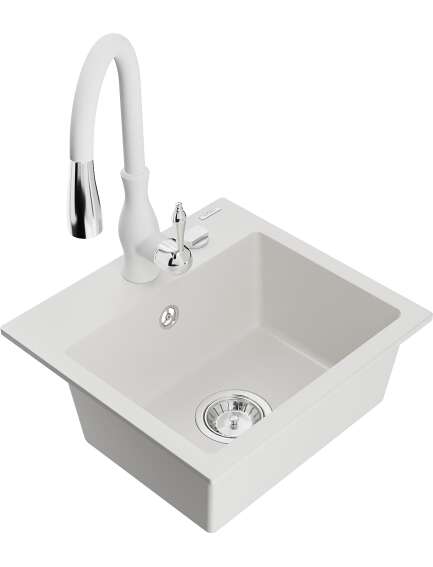 Mexen Milo zlewozmywak granitowy 1-komorowy z baterią kuchenną Savita, biały - 6505-20-672601-20